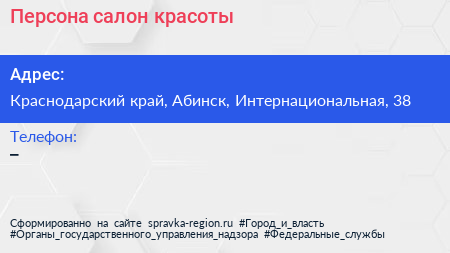 Персона, салон красоты по адресу Краснодарский край, Абинск, Интернациональная, 38 в дальнейшем Организация, размещена в следующих категориях:
