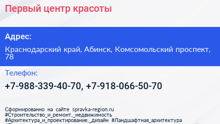 Первый центр красоты по адресу Краснодарский край, Абинск, Комсомольский проспект, 78 в дальнейшем Организация, размещена в следующих категориях: