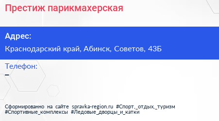 Престиж, парикмахерская по адресу Краснодарский край, Абинск, Советов, 43Б в дальнейшем Организация, размещена в следующих категориях: