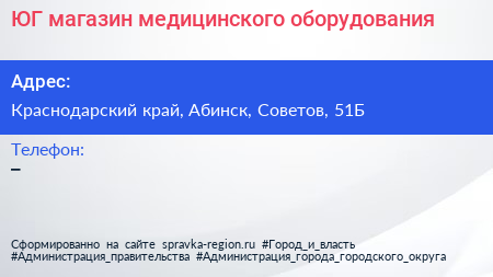 ЮГ, магазин медицинского оборудования по адресу Краснодарский край, Абинск, Советов, 51Б в дальнейшем Организация, размещена в следующих категориях: