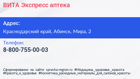 ВИТА Экспресс, аптека по адресу Краснодарский край, Абинск, Мира, 2 в дальнейшем Организация, размещена в следующих категориях: