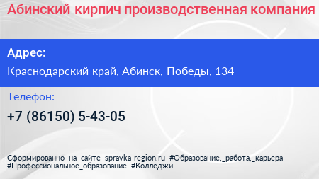 Абинский кирпич, производственная компания по адресу Краснодарский край, Абинск, Победы, 134 в дальнейшем Организация, размещена в следующих категориях:
