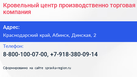 Кровельный центр, производственно-торговая компания по адресу Краснодарский край, Абинск, Динская, 2 в дальнейшем Организация, размещена в следующих категориях: