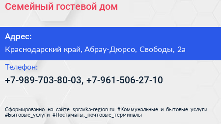 Семейный, гостевой дом по адресу Краснодарский край, Абрау-Дюрсо, Свободы, 2а в дальнейшем Организация, размещена в следующих категориях:
