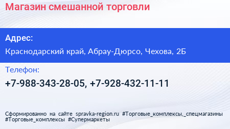 Магазин смешанной торговли по адресу Краснодарский край, Абрау-Дюрсо, Чехова, 2Б в дальнейшем Организация, размещена в следующих категориях:
