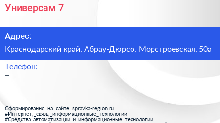 Универсам 7 по адресу Краснодарский край, Абрау-Дюрсо, Морстроевская, 50а в дальнейшем Организация, размещена в следующих категориях: