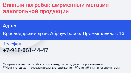 Винный погребок, фирменный магазин алкогольной продукции по адресу Краснодарский край, Абрау-Дюрсо, Промышленная, 13 в дальнейшем Организация, размещена в следующих категориях: