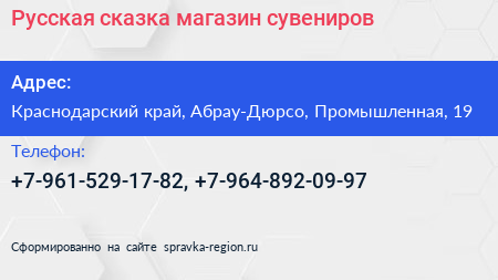 Русская сказка, магазин сувениров по адресу Краснодарский край, Абрау-Дюрсо, Промышленная, 19 в дальнейшем Организация, размещена в следующих категориях: