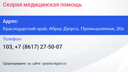 Скорая медицинская помощь по адресу Краснодарский край, Абрау-Дюрсо, Промышленная, 20а в дальнейшем Организация, размещена в следующих категориях: