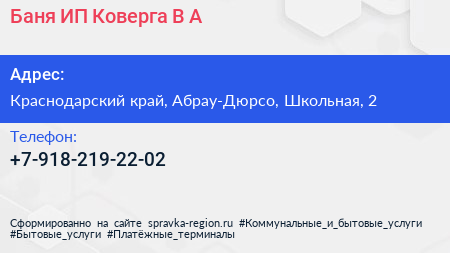 Баня, ИП Коверга В.А. по адресу Краснодарский край, Абрау-Дюрсо, Школьная, 2 в дальнейшем Организация, размещена в следующих категориях: