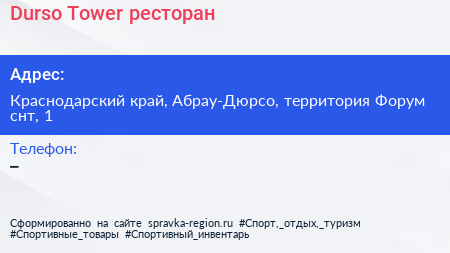 Durso Tower, ресторан по адресу Краснодарский край, Абрау-Дюрсо, территория Форум снт, 1 в дальнейшем Организация, размещена в следующих категориях: