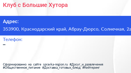 Клуб с. Большие Хутора по адресу 353900, Краснодарский край, Абрау-Дюрсо, Солнечная, 2а в дальнейшем Организация, размещена в следующих категориях: