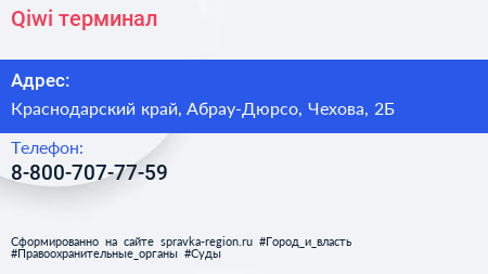 Qiwi, терминал по адресу Краснодарский край, Абрау-Дюрсо, Чехова, 2Б в дальнейшем Организация, размещена в следующих категориях:
