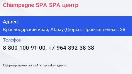 Champagne SPA, SPA-центр по адресу Краснодарский край, Абрау-Дюрсо, Промышленная, 38 в дальнейшем Организация, размещена в следующих категориях: