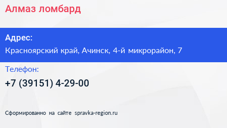 Алмаз, ломбард по адресу Красноярский край, Ачинск, 4-й микрорайон, 7 в дальнейшем Организация, размещена в следующих категориях: