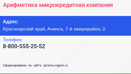 Арифметика, микрокредитная компания по адресу Красноярский край, Ачинск, 7-й микрорайон, 2 в дальнейшем Организация, размещена в следующих категориях: