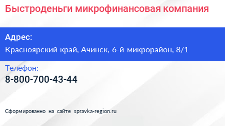 Быстроденьги, микрофинансовая компания по адресу Красноярский край, Ачинск, 6-й микрорайон, 8/1 в дальнейшем Организация, размещена в следующих категориях: