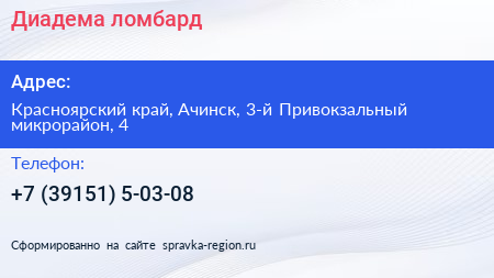 Диадема, ломбард по адресу Красноярский край, Ачинск, 3-й Привокзальный микрорайон, 4 в дальнейшем Организация, размещена в следующих категориях: