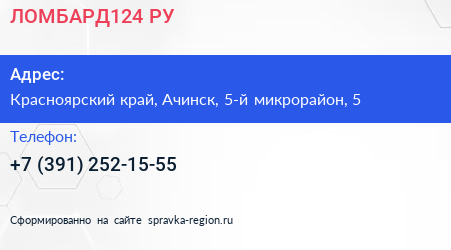 ЛОМБАРД124.РУ по адресу Красноярский край, Ачинск, 5-й микрорайон, 5 в дальнейшем Организация, размещена в следующих категориях: