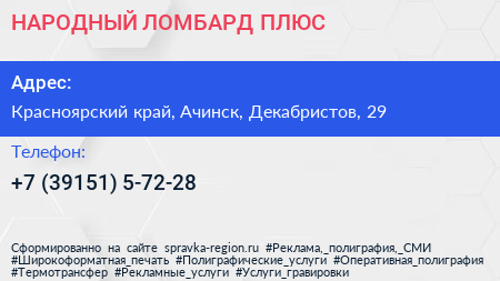 НАРОДНЫЙ ЛОМБАРД ПЛЮС по адресу Красноярский край, Ачинск, Декабристов, 29 в дальнейшем Организация, размещена в следующих категориях: