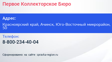 Первое Коллекторское Бюро по адресу Красноярский край, Ачинск, Юго-Восточный микрорайон, 50 в дальнейшем Организация, размещена в следующих категориях:
