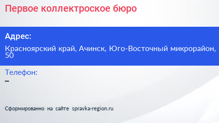 Первое коллектроское бюро по адресу Красноярский край, Ачинск, Юго-Восточный микрорайон, 50 в дальнейшем Организация, размещена в следующих категориях: