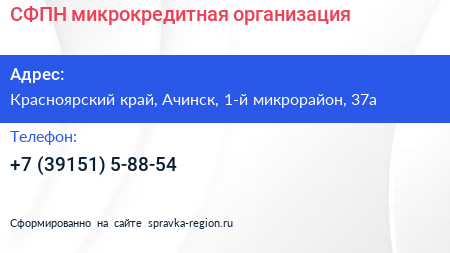 СФПН, микрокредитная организация по адресу Красноярский край, Ачинск, 1-й микрорайон, 37а в дальнейшем Организация, размещена в следующих категориях: