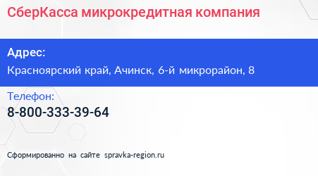 СберКасса, микрокредитная компания по адресу Красноярский край, Ачинск, 6-й микрорайон, 8 в дальнейшем Организация, размещена в следующих категориях: