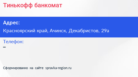 Тинькофф, банкомат по адресу Красноярский край, Ачинск, Декабристов, 29а в дальнейшем Организация, размещена в следующих категориях: