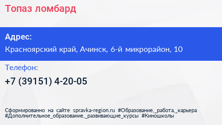 Топаз, ломбард по адресу Красноярский край, Ачинск, 6-й микрорайон, 10 в дальнейшем Организация, размещена в следующих категориях: