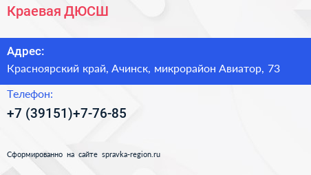 Краевая ДЮСШ по адресу Красноярский край, Ачинск, микрорайон Авиатор, 73 в дальнейшем Организация, размещена в следующих категориях: