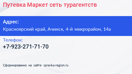 Путевка Маркет, сеть турагентств по адресу Красноярский край, Ачинск, 4-й микрорайон, 14а в дальнейшем Организация, размещена в следующих категориях: