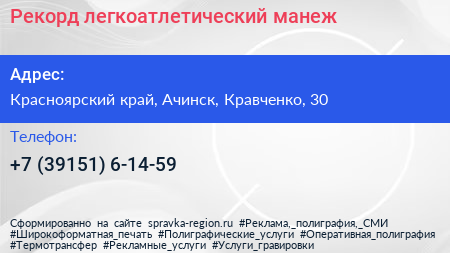 Рекорд, легкоатлетический манеж по адресу Красноярский край, Ачинск, Кравченко, 30 в дальнейшем Организация, размещена в следующих категориях: