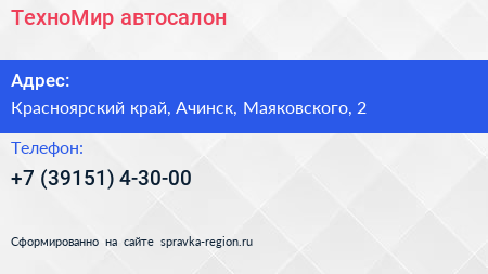 ТехноМир, автосалон по адресу Красноярский край, Ачинск, Маяковского, 2 в дальнейшем Организация, размещена в следующих категориях: