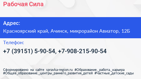 Рабочая Сила по адресу Красноярский край, Ачинск, микрорайон Авиатор, 12Б в дальнейшем Организация, размещена в следующих категориях: