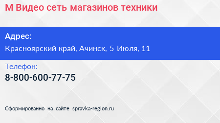 М.Видео, сеть магазинов техники по адресу Красноярский край, Ачинск, 5 Июля, 11 в дальнейшем Организация, размещена в следующих категориях: