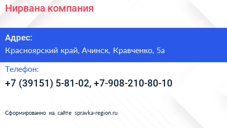 Нирвана, компания по адресу Красноярский край, Ачинск, Кравченко, 5а в дальнейшем Организация, размещена в следующих категориях: