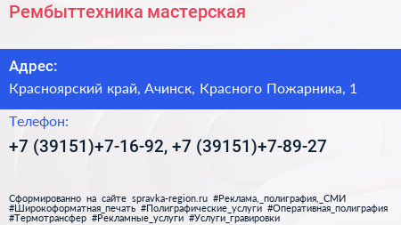 Рембыттехника, мастерская по адресу Красноярский край, Ачинск, Красного Пожарника, 1 в дальнейшем Организация, размещена в следующих категориях: