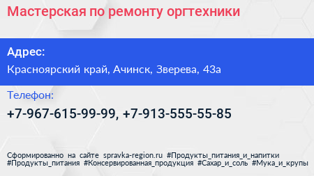 Мастерская по ремонту оргтехники по адресу Красноярский край, Ачинск, Зверева, 43а в дальнейшем Организация, размещена в следующих категориях: