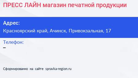 ПРЕСС ЛАЙН, магазин печатной продукции по адресу Красноярский край, Ачинск, Привокзальная, 17 в дальнейшем Организация, размещена в следующих категориях: