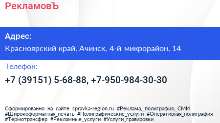 РекламовЪ по адресу Красноярский край, Ачинск, 4-й микрорайон, 14 в дальнейшем Организация, размещена в следующих категориях: