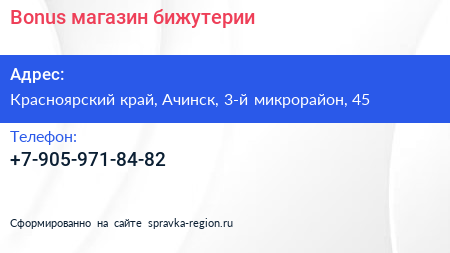 Bonus, магазин бижутерии по адресу Красноярский край, Ачинск, 3-й микрорайон, 45 в дальнейшем Организация, размещена в следующих категориях: