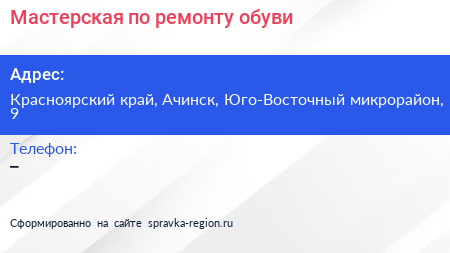 Мастерская по ремонту обуви по адресу Красноярский край, Ачинск, Юго-Восточный микрорайон, 9 в дальнейшем Организация, размещена в следующих категориях: