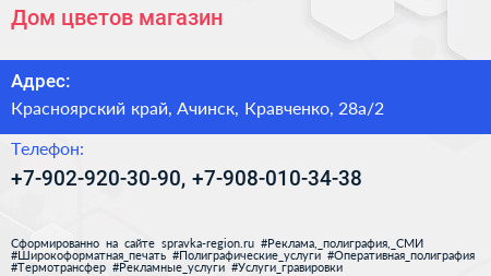 Дом цветов, магазин по адресу Красноярский край, Ачинск, Кравченко, 28а/2 в дальнейшем Организация, размещена в следующих категориях: