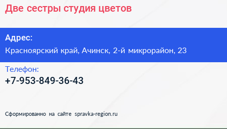 Две сестры, студия цветов по адресу Красноярский край, Ачинск, 2-й микрорайон, 23 в дальнейшем Организация, размещена в следующих категориях: