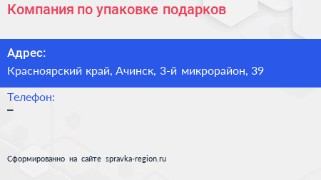 Компания по упаковке подарков по адресу Красноярский край, Ачинск, 3-й микрорайон, 39 в дальнейшем Организация, размещена в следующих категориях: