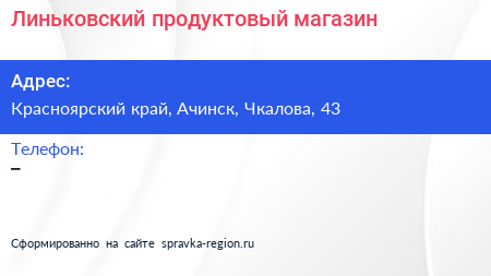 Линьковский, продуктовый магазин по адресу Красноярский край, Ачинск, Чкалова, 43 в дальнейшем Организация, размещена в следующих категориях: