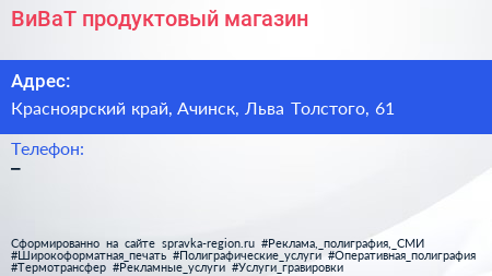 ВиВаТ, продуктовый магазин по адресу Красноярский край, Ачинск, Льва Толстого, 61 в дальнейшем Организация, размещена в следующих категориях: