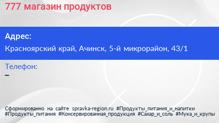 777, магазин продуктов по адресу Красноярский край, Ачинск, 5-й микрорайон, 43/1 в дальнейшем Организация, размещена в следующих категориях: