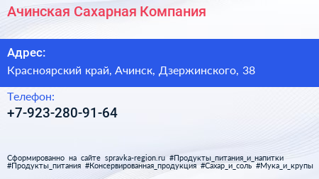 Ачинская Сахарная Компания по адресу Красноярский край, Ачинск, Дзержинского, 38 в дальнейшем Организация, размещена в следующих категориях: